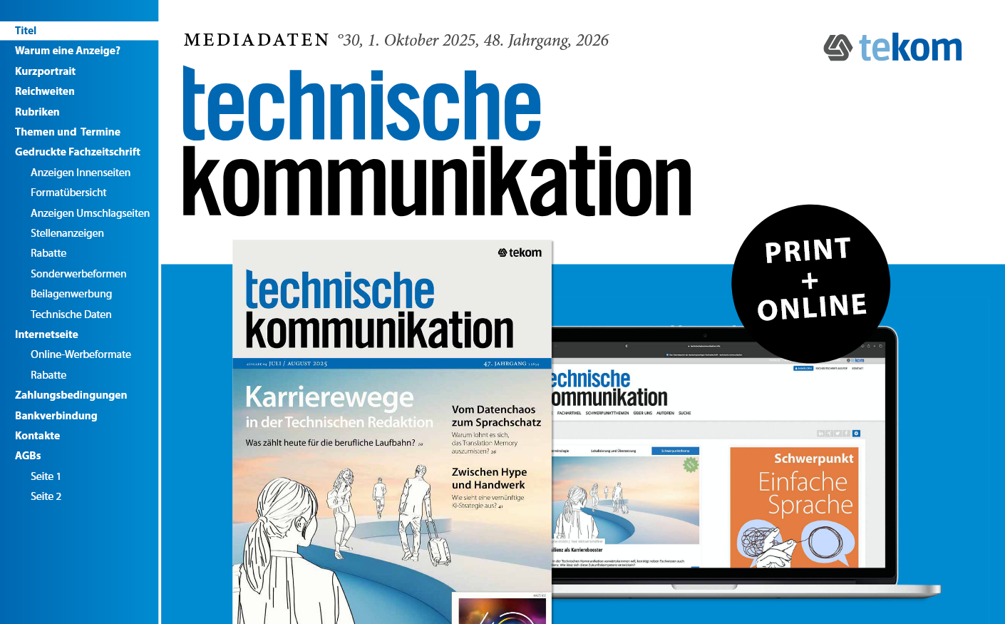 Möchten Sie Ihr Unternehmen in unserer Fachzeitschrift ’technische kommunikation’, auf tekom.de oder tekom.eu präsentieren und von unserer großen Reichweite profitieren?